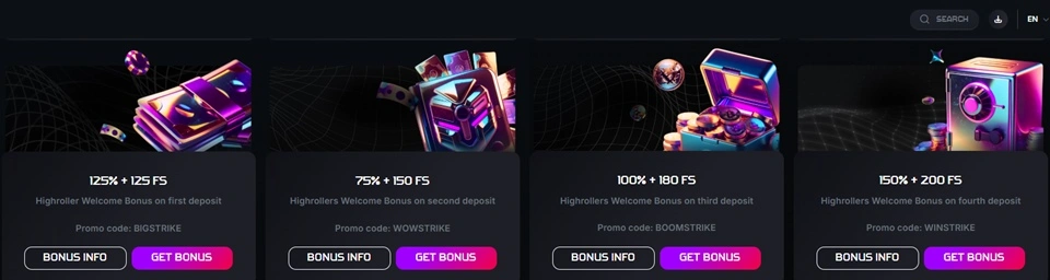 | First Deposit Bonus | Offer: 125% + 125 free spins | Promo code: BIGSTRIKE |